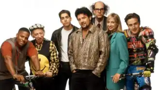 The cast of Double Rush. From left: D. L. Hughley, Phil Leeds, Adam Goldberg, Robert Pastorelli, Sam Lloyd, Corrinne Bohrer, and David Arquette.