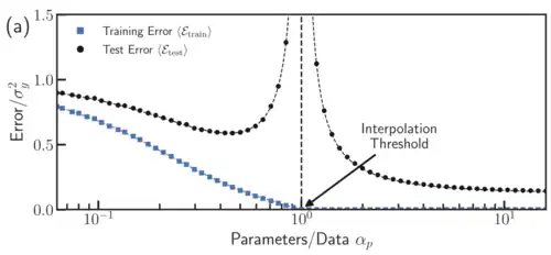 Double descent in statistics and machine learning is the phenomenon where a model with a small number of parameters and a model with an extremely large number of parameters both have a small training error, but a model whose number of parameters is about the same as the number of data points used to train the model will have a much greater test error than one with a much larger number of parameters.[2] This phenomenon has been considered surprising, as it contradicts assumptions about overfitting in classical machine learning.[3]