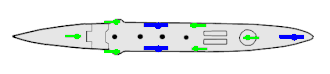 Note placement of QF guns (green) and torpedo tubes (blue).