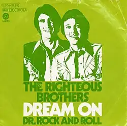 "Dream On" is a song written by Dennis Lambert and Brian Potter. In 1974, The Righteous Brothers had a hit version, reaching No. 32 on the Billboard Hot 100,[2] and No. 6 on the U.S. and Canadian Adult Contemporary charts.[3][4] Bill Medley and Bobby Hatfield alternate lead vocals.
