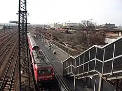 A new island platform including an entrance building was built for the local passenger traffic some 100 metres to the west of the former passenger station. Passenger trains used the new facilities from 15 October 1892.[8] The station building was not rebuilt after heavy damage in the Second World War, although a service building was built on the basement and foundations of the less formal eastern part. The railway facilities for passenger and freight traffic covered a total of over 54.4 hectares; the length of track at their opening totalled 76.7 kilometres.[8]