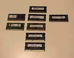 A SO-DIMM (pronounced "so dim" /ˈsoʊdɪm/, also spelled SODIMM) or small outline DIMM, is a smaller alternative to a DIMM, being roughly half the physical size of a regular DIMM. The first SO-DIMMs had 72 pins and were introduced by JEDEC in 1997.[8][9][10] Before its introduction, many laptops would use proprietary[11] RAM modules which were expensive and hard to find.[8][12]