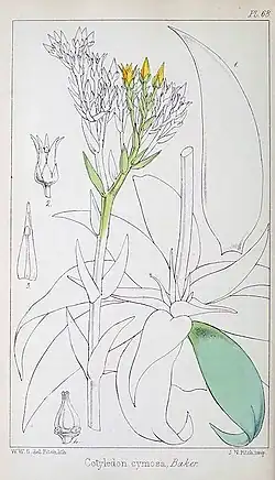 The original description is from 1858 by Charles Antoine Lemaire, in the 10th issue of L'Illustration Horticole, as Echeveria cymosa. Lemaire's plants came from cultivated plants in Europe, with their original locality simply listed as "California". As there was no authentic type specimen, the neotype for the species is an illustration by John Gilbert Baker of his subsequent combination, Cotyledon cymosa, in William Saunder's Refugio Botanicum.[1]