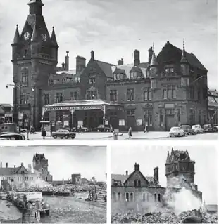 The third station, built for the Caledonian Railway in 1889–1890, was designed by Thomas Barr.[2] It was of red sandstone and built in the Scottish Baronial style.[1] Scottish architectural historian Charles McKean, and his co-authors of a book on Dundee's lost architectural heritage, described the building as "overly bombastic in nature" and suggest that it was built as "a gesture of defiance" by the Caledonian Railway in response to the arrival of an alternate route in Dundee run by its bitter rival the North British Railway via the Tay Rail Bridge.[4] It was demolished upon closure.[1] Trains ran to Manchester, Liverpool and London, while local traffic took passengers to Gleneagles, Crieff and Blairgowrie.[2] At its height, the station employed scores of people and handled 15,000 tons of minerals (mostly coal for Dundee's factories).[2]
