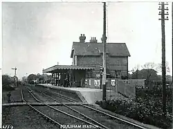 The plans for the East Norfolk Railway's Aylsham, Cromer and North Walsham lines were first deposited in 1859.[1] The line opened as far as North Walsham in 1874, but was in an incomplete state – with neither crossing keeper's cottages or goods sheds being finished. This contributed to a lack of early cash flow, and liquidity, delayed the extension to Cromer.[2] A temporary railhead was opened at Gunton on 29 July 1876.[3] Gunton station, and the crossing keeper's cottages to the south, were built by Lord Suffield to blend into the estate.[4] The single track railway between Norwich and Cromer being finally opened for the summer of 1877 – although the lightly constructed sand embankments were noted as a concern by the line's inspector. At this time, North Walsham contributed 68.5% of the line's receipts.[5]