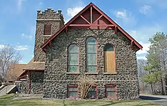 Valk designed the structure in a Bungalow/Craftsman and Rustic style that was popular in the early twentieth century. The structure is 35 ft × 72 ft (11 m × 22 m) and constructed of local field stone with timber accents. It sits on a sloped site with the sanctuary on the main level above a basement. A gabled vestibule dominates the center of the south façade and houses the primary entry. The tower rises from the roof of the vestibule and is capped with a stepped parapet. Three large stained glass windows with arched tops dominate the east wall of the sanctuary which features a post and beam ceiling. When constructed, the main level contained a movable partition allowing the space to accommodate worship services and Sunday school.