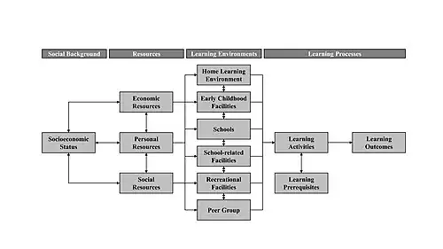 A broad range of factors contributes to the emergence of socioeconomic achievement gaps. The interaction of different aspects of socialization is outlined in the model of mediating mechanisms between social background and learning outcomes.[19][18] The model describes a multi-step mediation process. Socially privileged families have more economic, personal, and social resources available than socially disadvantaged families. Differences in family resources result in differences in the learning environments experienced by children. Children with various social backgrounds experience different home learning environments, attend different early childhood facilities, schools, school-related facilities, and recreational facilities, and have different peer groups. Due to these differences in learning environments, children with various social backgrounds carry out different learning activities and develop different learning prerequisites.