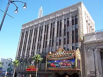 The theater is built into a six-story office building built in the 1920s.[4] The design featured an exterior done in California Churrigueresque style of Spanish Colonial Revival architecture exterior designed by Stiles O. Clements of the architectural firm of Morgan, Walls & Clements, and mixed interior by G. Albert Lansburgh.[1] The interior is a lavish East Indian in the main auditorium, English Tudor in the wood-paneled lower lobby and Italian Baroque on the facade.[1]