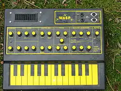 Launched in 1978 at a price of £199 (equivalent to £1,442 in 2023),[2] the Wasp was EDP's best-received product. It was named after its black-and-yellow colour scheme. For cost reasons, it did not have a mechanical keyboard; instead, it used flat conductive copper plates, hidden under a silk-screened vinyl sticker.[1] This alienated some players who thought the instrument lacked the expression present with a real keyboard.[3] It was also difficult to use in live settings, and according to Gerald Casale of Devo, the synth would play itself when exposed to sweat.[4] Despite these flaws, the Wasp was fairly advanced technologically. It was one of the first commercially available synthesisers to adopt digital technology, which at the time was just beginning to become a standard. It also utilised a proprietary system for connecting several Wasp synthesisers together, predating MIDI by several years.[1][a] The Wasp had a tiny internal speaker, which gave the instrument a distinctive sound, though it could also be amplified externally. Eurythmics' David A. Stewart recorded the Wasp by miking its internal speaker.[1]
