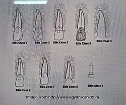 The common classification for tooth fracture is the Ellis and Davey Classification of tooth fracture (1960). It differentiates tooth fractures based on the extent of damage to tooth surfaces involved. This classification system is used to determine the severity of tooth fractures and to decide the treatment plan accordingly. (Diangelis & Bakland, 1998) Class I – Simple fracture of crown involving only enamel with little or no dentine involvement.