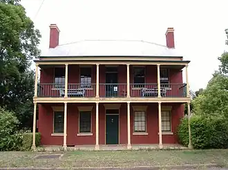 It has a cellar, an early kitchen (that appears to pre-date the house, c. 1826) with wood-fired bread oven (and original hand made door), and back-to-back fireplaces with the adjoining flagged-floor scullery. Most of the lath and plaster ceilings remain, with original hand run ceiling roses in both the first floor reception room and the downstairs drawing room, the latter also retaining its original hand-run cornice. The house has an unusual architectural feature in that the front section of the house sits deliberately at an angle to the street front (less than 90). This appears to be due to the pre-existence of the kitchen, which may (along with a previous attached timber building) have been built at 90 degrees to a dirt road that had altered when the road was later formalised with stone gutters.[1]