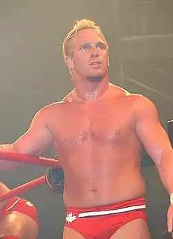 Team Canada began feuding with The Naturals and Lance Hoyt, with Young, Roode and A-1 defeating Hoyt and The Naturals at No Surrender on July 17.[12] America's Most Wanted formed a loose alliance with The Naturals against Team Canada, with Young, Roode, Williams and A-1 defeating The Naturals and America's Most Wanted at Sacrifice on August 14.[13] After Williams renewed his pursuit of the X Division Championship, Young began teaming with A-1 on a regular basis. At Unbreakable on September 11, Young and A-1 faced America's Most Wanted, Alex Shelley and Johnny Candido and defending champions The Naturals in a four-way tag match. Young was able to pin both Candido and "Wildcat" Chris Harris, but Team Canada lost the match after Chase Stevens managed to pin A-1.[14]