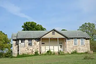 The Eros School Building is a historic school building in the small rural community of Eros, Arkansas, at the junction of Arkansas Highway 125 and Marion County Road 4018. It is a single-story Plain Tradition stone structure, with a Craftsman-style side-gable roof with exposed rafter tails. A gable-topped porch projects from the main (west-facing), supported by slender columns on a concrete base. The porch pediment, like those on the sides, is stuccoed. The school was built in 1935 as part of a Depression-era jobs program.[2]