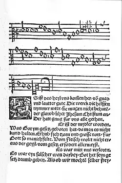 ![]() "ES iſt das heyl vns kom̃en her" in the Erfurt Enchiridion, 1524 | |