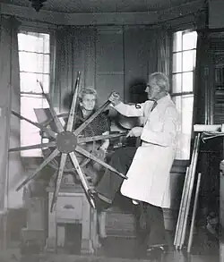 In April 1940, Gabain was commissioned by the War Artists' Advisory Committee, WAAC, to produce four lithographs of Women's Voluntary Services members and four on the subject of children being evacuated from London and other cities. Gabain actually offered WAAC thirteen lithographs for this commission but they only accepted the original eight commissioned.[12] WAAC published these as two sets of lithographs, Children in Wartime with five images and Women's Work in the War other than the Services, which had six images.[13] In total WAAC acquired 38 works by Gabain during the War.[14] For these commissions Gabain, although often in poor health, travelled all over Britain. She went to the Scottish Highlands to record the work of women lumberjacks, known as "lumberjills", at a Women's Land Army camp in Banffshire and to Devon to depict children evacuated there from London.[1] Throughout the War, Gabain recorded women working in what, in peacetime, had been traditionally male crafts and trades. As well as women salvage workers, factory workers, ARP wardens and air raid workers, Gabain produced a portrait of Captain Pauline Gower of the Air Transport Auxiliary.[15] In 1945, she produced a series of portraits that included Barbara Ward and Caroline Haslett.[16][17]
