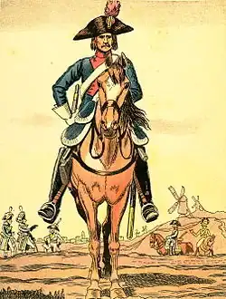 As the French Revolutionary Wars broke out, Nansouty soon found himself in the position of having to take provisional command of the whole 9th Cavalry Regiment, as he was the most senior chef d'escadron (Lieutenant-Colonel) of the regiment when the commander, Colonel Badda de Bodosalva, fell ill at the end of May 1792.[5] His regiment was a part of the "Army of the Rhine" and was integrated in General Custine's Corps, which was to march towards the Palatinate, where the first military manoeuvres took place. As Colonel Badda de Bodosalva died at the end of October that year, Nansouty naturally expected to be appointed commander of the regiment in his place. However, Custine appointed the more senior Lieutenant-Colonel Loubat de Bohan as commander of the 9th Cavalry and, despite Nansouty's protestations, maintained his decision. With Loubat in command, the 9th saw action against the Prussians in an engagement at Ober-Flörsheim on 30 March 1793. After a first successful charge, Nansouty's 1st squadron was counter-charged by enemy hussars; the remaining squadrons under Loubat quickly caught up with Nansouty's squadron and together they broke the enemy. Corps commander Custine was then called up to command the Army of the North but, before leaving his command, he attempted a last daunting move against the Habsburg army. This required a night march, not usually undertaken by cavalry, and poorly coordinated manoeuvres of cavalry, infantry and artillery. This led to total failure of the action of 17 May. During this action, though, the initial charge of the corps cavalry, which included the 9th, successfully took a number of enemy guns. However, a Habsburg counter-charge forced them back in disorder, which spread panic among the ranks of oncoming infantry.[6]