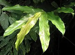 Etlingera maingayi grows to less than 2 m (6 ft 7 in) high.[6] Its leaves are variable, with undulating fringes, and emit a sour scent when crushed.[7] Young leaves are translucent and reddish on both sides.[5]