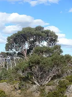 Eucalyptus coccifera, commonly known as the Tasmanian snow gum,[3] is a small to medium-sized tree in the Eucalyptus genus, endemic to Tasmania. It has smooth, grey and cream-coloured bark, elliptic to lance-shaped adult leaves, flower buds in groups of between three and nine, usually white flowers and conical, hemispherical or cup-shaped fruit.