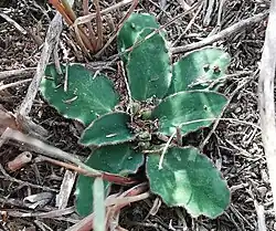 It is dioecious and its yellow-green 5mm flowers (cyathia) appear over the Winter, on short (1–5 cm), trailing peduncles.[1] [2][3]