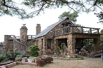 The Evelyn Gill Walker House is a historic house at 18 South Spruce Street in Paris, Arkansas. Built by mason Tolbert E. Gill over a several-year period beginning in 1938, it is a distinctive example of Gill's Rustic style, with a stone veneer exterior and decorative components. It has a 1+1⁄2-story gabled main section, with a flat-roof porch in front, and a flat-roof ell in the rear. The ell features a turret with a bell-cast top, with a surrounding curved staircase leading to an open deck on the ell's roof.[2]