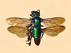 - ^ Garófalo, Carlos Alberto.; Rozen, Jerome George, 1928 Parasitic behavior of Exaerete smaragdina with descriptions of its mature oocyte and larval instars (Hymenoptera, Apidae, Euglossini). American Museum Novitates ; no. 3349