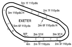 Exeter is an undulating right handed course of about two miles, flanked with heather and gorse bushes and set in superb countryside, six miles from Exeter.[4] The original course was described as a "fine oval course of two miles", though in the 1850s an additional flat course was added, one mile long, making the total course length three miles. By the 1940s, the steeplechase matched the line of the original course.[5] One lap of the course includes eleven fences, two of which are open ditches and one a water jump.[10] The first part of the back straight is downhill, followed by a long climb which takes in four fences. The course then sweeps downhill into the home straight, which is uphill to the line. From the winning post, the ground falls round the first bend, where the water jump is taken. The course continues downhill over two more fences, including an open ditch before a brief climb to the back straight.[4]