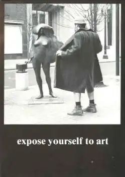The "Expose Yourself to Art" poster showed Bud Clark apparently flashing an artwork, titled Kvinneakt, Norman J. Taylor's bronze sculpture of a nude woman. Clark appeared to be wearing only a raincoat, but it was later revealed that he was wearing shorts and a T-shirt under his raincoat.[1][2]