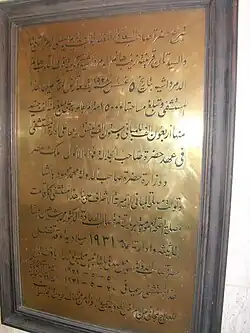 "The honourable late Pasha Abdel-Rahim Moustafa El-Demerdash (may he have all God's forgiveness) and the two ladies his wife Zainab Hanem El-Demerdashiah and his daughter Qout Alqoulob Hanem El-Demerdashiah have donated—on the 5th of August 1928—by the piece of land on which this Hospital was erected which is 15,000 meter square, and donated the sum of 100,000 Egyptian Royal Pounds to be divided as 40,000 for the building of the hospital and 60,000 to be put into a Waqf and its benefits are dedicated to the expenses of running the hospital."