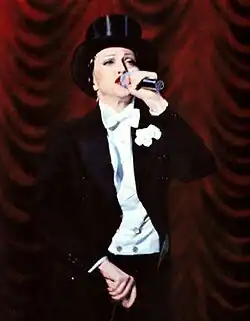 Justyna Stępień from the University of Łódź described her work and style as a representation of the Camp-Lite phenomenon.[30] J. Randy Taraborrelli wrote that religious symbols became a crucial part of her fashion.[31] Sydney Nowak of KOST noted she brings a tinge of grunge to various outfits.[32] She wore long dresses several times in the mid-1990s.[26] Among the different aesthetics explored by Madonna, are cowgirl, ghetto fabulous, military, masculine pieces and androgynous imagery.[33] She has also sported thrift shop looks,[34] and high fashion.[35] In early 2020s, Vogue noted her off-stage aesthetic of "dirtbag-chic" style.[36] She has also paid tribute through clothes to other women such as Marilyn Monroe, Marie Antoinette and Eva Perón.[34][37]