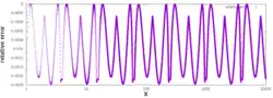 As noted above, the approximation is very accurate. The single graph on the right plots the error of the function (that is, the error of the approximation after it has been improved by running one iteration of Newton's method), for inputs starting at 0.01, where the standard library gives 10.0 as a result, and InvSqrt() gives 9.982522, making the relative difference 0.0017478, or 0.175% of the true value, 10. The absolute error only drops from then on, and the relative error stays within the same bounds across all orders of magnitude.