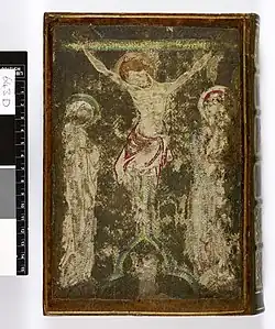 On the lower side, on a groundwork of gold similar to that on the upper cover, is a design of the Crucifixion. Our Saviour wears a red garment round the loins, and round his head is a red and yellow nimbus, his feet being crossed in a manner often seen in illuminations in ancient manuscripts. The cross is yellow with a green edge, the foot widening out into a triple arch, within which is a small angel kneeling in the attitude of prayer. On the right of the cross is a figure of the Virgin Mary, in robes of pale blue and yellow, with a white head-dress and green and yellow nimbus. On the left is another figure, probably representing St. John, dressed in robes of red and blue, and having a nimbus round his head of concentric rings of red and yellow. This figure is unfortunately in very bad condition. The edges of the leaves of the book are painted with heraldic bearings in diamond-shaped spaces, that of the Felbrigge family 'Gules, a lion rampant, or' alternately with another 'azure, a 32 fleur-de-lys, or.'[4]