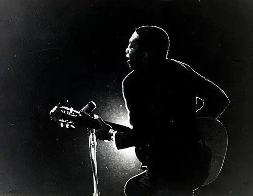 This edition of the festival reflected the growing movimento negro through the expanded presence of Afro-Brazilian musicians.[69] One example was Dom Salvador who performed the spiritual "Abolição 1860–1960" with a band dressed in bright African robes.[70][71] Another was Jorge Ben who entered with "Eu Também Quero Mocotó" (lit. 'I Want Mocotó Too'), a soul song sung by Erlon Chaves, the former music director for the festival. The song used mocotó (a Brazilian dish) as slang for female legs. It was a hit with the audience and invited to be performed again during the closing ceremony of the international phase.[72][73] For this final performance, Chaves performed a new routine where he was kissed by a couple of the white background dancers.[74] This led to his arrest for public indecency (alongside Globo network executive Boni) under orders of the military.[75] Both were later released, but Chaves was banned from performing for thirty days. It is largely believed he was only arrested because the image of a black man being kissed by white women had offended the conservative dictatorship.[76][77][78] Afterward, "I want mocotó" became a popular slogan for ridiculing the government.[c][79][80]
