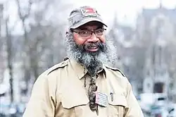 Filep Karma wearing his East Timorese hat and West Papuan flag as his clothing pin.