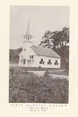 Lamoine's Baptist congregation was established in the early 19th century, and this building was built for it in 1932 by Seth Tisdale, a noted local builder and designer. The congregation split in the 1840s, resulting in the construction of another church in the town, although the two congregations later reunited. This building was altered in 1879 to designs by Asa Hodgkins, a noted builder from Ellsworth, to replace the tower and add the porches in the then fashionable Italianate and Stick style. In the 20th century the building was deeded to the cemetery association that controls the cemetery behind the building, and it was given by them to the local historical society in the 1970s. The building was moved back one length in the 1980s, at which time it was set on a new foundation.[2]