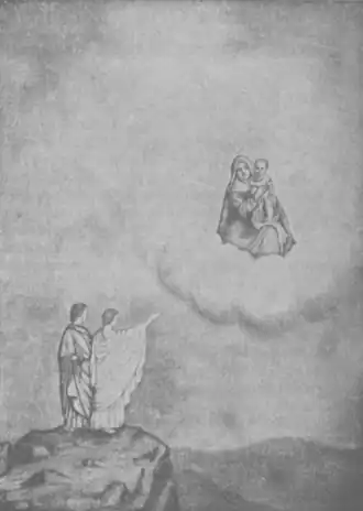 Lehi has a vision of the tree of life, which includes a revelation that a Messiah would visit the earth within 600 years. In the vision, Lehi sees a tree next to a river and eats its fruit, which makes him joyful. Wishing to share the fruit with his family, he sees his wife, Sariah, and two sons, Nephi and Sam, who come and eat with him. His two oldest sons, Laman and Lemuel, stay near the river and do not eat the fruit. Then Lehi sees an iron rod and a "strait and narrow path" which leads to the tree.[7] People try to get to the tree, but are lost in the "mist of darkness".[8] Some get to the tree by holding on to the rod, but they are ashamed when they eat the fruit. Across the river, a "great and spacious building" is full of people who are making fun of those who ate the fruit, and subsequently, the fruit-eaters become lost.[9][10]