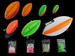 Floats come in different sizes and shapes, and can be made from various materials, such as foam, balsa wood, cork, plastic, Indian sarkanda reed,[7] or even bird/porcupine quills.