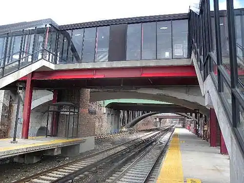 Fleetwood station was originally built on October 25, 1924 by the New York Central Railroad. The Cross County Parkway was built over the station, and was widened during the 1950s and 1960s.[4][5] As with the rest of the Harlem Line, the merger of New York Central with Pennsylvania Railroad in 1968 transformed it into a Penn Central station, whose service was gradually merged with the Metropolitan Transportation Authority, and officially became part of Metro-North in 1983. In the Spring of 1989, the platforms were reconstructed, along with those of Bronxville, Tuckahoe, and Crestwood stations.[6] A two-track girder bridge over the Bronx River can be found north of the station. When the station was triple-tracked, a new bridge for the third track was built north of the station.[7]