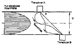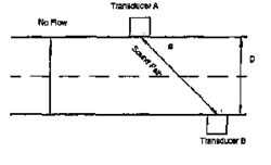 Due to the relative age of the technology, it may be beneficial to discuss the operation of the multipath ultrasonic meter to illustrate the effects of flow profile distortion and swirl. There are various types of flow measurements utilizing high frequency sound. The custody transfer measurement devices available today utilize the time of travel concept. The difference in time of flight with the flow is compared to the time of flight against the flow. This difference is used to infer average flow velocity on the sound path.[14] Fig.(5) showing the Ultrasonic Meter sound path no flow which illustrates this concept.
