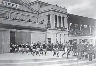 The teams of Germany and Finland entering the field before the final of the 1925 Workers' Summer Olympiad in Frankfurt.