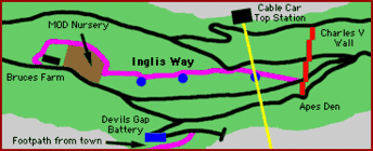 Inglis Way is a footpath with a length of around 1,200 metres (3,900 ft) that traverses the middle section of the Upper Rock,[16] linking various disused observation posts and emplacements.[17] The origins of its name are uncertain; it may have been named after a person named Inglis, or it may have derived from an old Spanish name, el Camino del ingles, "the Englishman's Path".[18] It is the second longest path in the nature reserve after the Mediterranean Steps.[16]