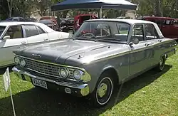 The 1964 US Fairlane 500 sedan was assembled by Ford Australia from December 1963 as the FD model.[12] It was introduced in April 1964, distinguished by a lack of tail fins[10] and a new grille with seven vertical bars.[13] A choice of two powertrains was offered in the new model, a 260-cubic-inch (4.3 L) Windsor V8 with Ford-O-Matic automatic transmission or a 289-cubic-inch (4.74 L) Windsor V8 with Cruise-O-Matic automatic transmission.[10] The 1964 model was the last of the US Fairlanes in Australia, as Ford discontinued the model locally in 1965 to make way for the larger Ford Galaxie;[10] 1,344 examples were produced in Australia.[9]