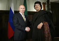 In April 2008, Putin visited Libya where he met the leader Muammar Gaddafi, the country welcomed the idea of creating an OPEC-like group of gas-exporting countries, Putin became first Russian President who visited Libya, he remarked the visit as "We are satisfied about the way in which we resolved this problem. I am absolutely convinced that the solution we have found will help the Russian and Libyan economies."[99]