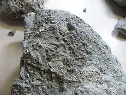 A fossil hash is either a sediment or sedimentary rock composed predominately of fragmented fossils of either shells, tergites, bones, teeth, other hard parts, or some combination of these remains.[1][2] The fossil hard parts of various animals, including brachiopods, corals, crinoids, bryozoans, ostracods, pelecypods, and trilobites, occur in shell hashes. If the fossil hash consists almost exclusively of one type of fossil, it is often named after that fossil, as in the case of crinoidal hash,[3] trilobites hash,[4] and oyster-shell hash.[5] Depending on the amount of matrix mud, fossil hashes have been classified as either packstones, grainstones, or more rarely as wackestones, of The Dunham classification system for carbonate sedimentary rocks.[6]