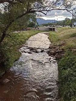 Fountain Creek is a creek that originates in Woodland Park in Teller County and flows through El Paso County to its confluence with the Arkansas River near Pueblo in Pueblo County, Colorado.[1][2] The 74.5-mile-long (119.9 km) creek,[3] once known as the Fontaine qui Bouille,[4][5] is a tributary of the Arkansas River.[6]: 8