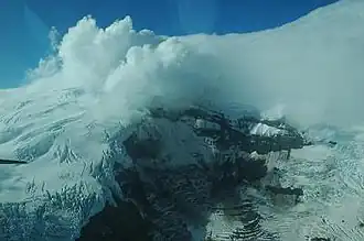 Terminus of Fourpeaked Glacier with dark-colored sediment issuing from an elongate tunnel in the ice. Photo taken Sept 20, 2006 | |