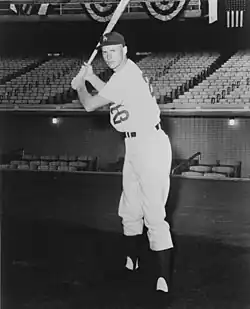 In 1962, Howard batted .296 with 31 home runs and finished among the NL's top five players in RBIs (119) and slugging (.560). He won the NL Player of the Month award in July with a .381 average, 12 home runs, and 41 RBIs.[9] The season ended with the Dodgers and San Francisco Giants tied for first place. In the three-game pennant playoff that followed Howard had only a single in 11 at-bats and struck out three times against Billy Pierce in the first game, including the final out; but he had a run and an RBI in the second contest, an 8–7 win. The Giants took the pennant in three games, but Howard ended up ninth in the MLB Most Valuable Player award voting.[10]