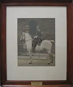 An official photograph of Richardson on a white horse in full dress uniform was taken outside the Hereford Police Station, Gaol Street, in 1919. This photograph was used in the local press and various publications which mentioned his career when he would retire at the end of the year.[51] He retired from his post on 30 December 1919.[52][53] His last official appearance in his position as Chief Constable of Hereford was appropriately enough in the court where he had presented many cases over the years on Friday 16 January 1920 when the mayor and city officials publicly thanked him for all his years of service. After a final bow to the court he, accompanied by his successor, Mr. Rawson, "addressed an unusually good muster of the city Police Force, who had formed up at the Parade Office at the Police Station."[54] A week earlier he had been presented with an illuminated address by the council and magistrates.[55] The city Fire Brigade held a separate presentation to their chief in the following week when he was reported to have made a long speech detailing the fires he had attended since 1883. He had also received a solid silver tea set from members of the Hereford City Police. During his time in office he had served three monarchs and over twenty mayors.