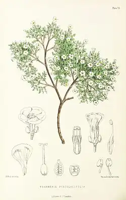 Frankenia portulacifolia, also called Saint Helena tea or tea plant, is a species of salt-tolerant plant in the Frankeniaceae family. It is endemic to the islands of Saint Helena, Ascension and Tristan da Cunha. Its natural habitats are inhospitable, dry and rocky areas and rocky shores, often on weathered volcanic ash. As its total population has been estimated at only around 3,500 individuals, it is currently classified as Critically Endangered by the IUCN.[1]