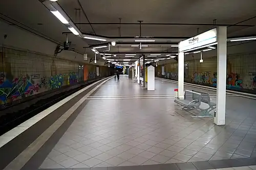 Frankfurt (Main) Mühlberg station is an underground Rhine-Main S-Bahn station on the Frankfurt City Tunnel in the Frankfurt district of Sachsenhausen in the German state of Hesse. The station is classified by Deutsche Bahn as a category 4 station.[1] It was opened with the eastern part of the City Tunnel (which is called the Frankfurt–Mühlberg tunnel), which was opened in 1992 as the last section of the City Tunnel. It consists of two tracks on either side of an island platform.