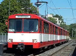 The U3 Class was based on the U2, but slightly longer (24.49 m), with a body made entirely of steel, and without any steps for access from low platforms.[13] Duewag built 27 vehicles in 1979 and 1980,[14] which were originally deployed on the U4 and transferred to the U6 in 2015.[13]